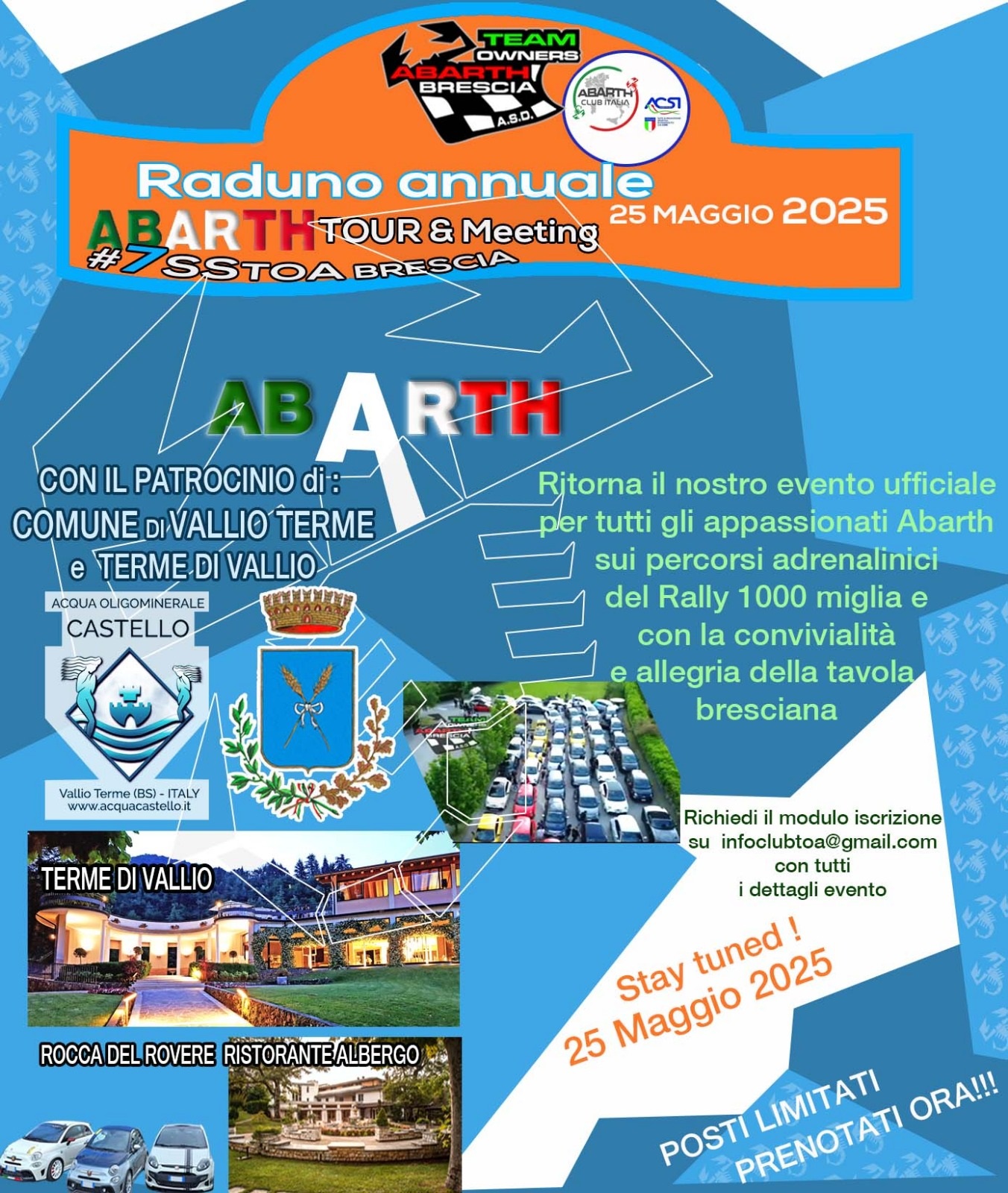 Domenica 25 maggio 2025 presso le Terme di Vallio si terrà il raduno annuale "Abarth tour and meeting".